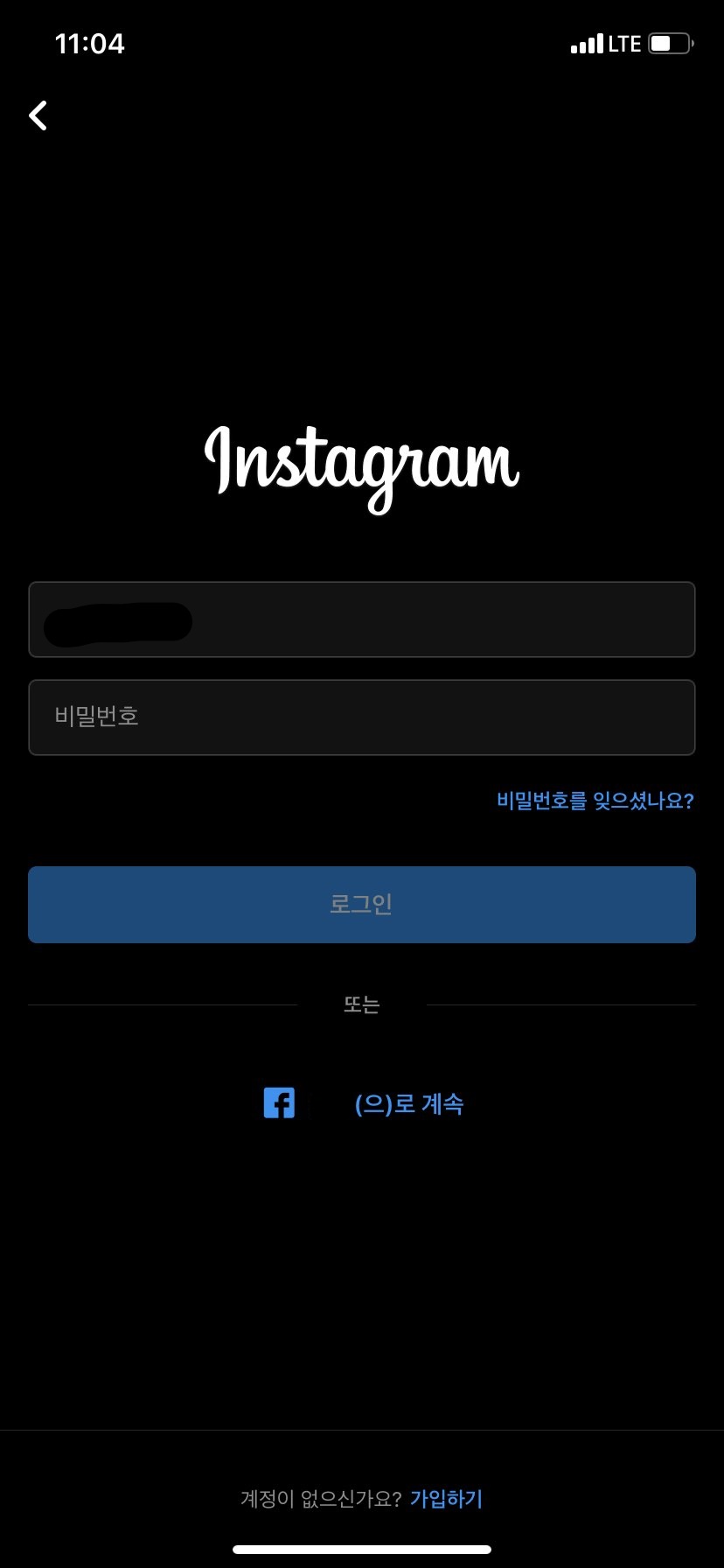 인스타그램에 들어가서 로그인을 시도해도 안된다면 '비밀번호를 잊으셨나요?' 라고 적힌 버튼을 눌러줍시다!