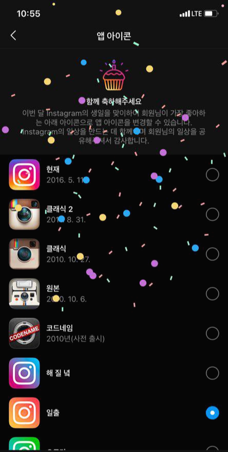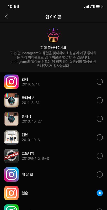 벌써 인스타그램이 10년이나 되었군요.. 인스타그램의 생일을 맞이해서 아이콘을 취향대로 바꿀 수 있는 기능을 추가하게 되었나봐요!!! 완전 예전에 쓰던 감성 아이콘이 있네요!