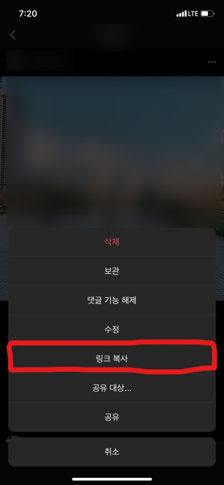 그럼 메뉴창이 나옵니다. 여기서 '링크 복사'를 눌러줍시다. 그러면 링크복사가 되었다고 상단에 뜹니다.