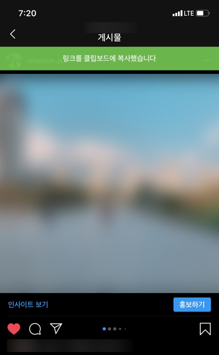 인스타그램은 페이스북과는 다르게 공유하기 버튼이 없습니다.