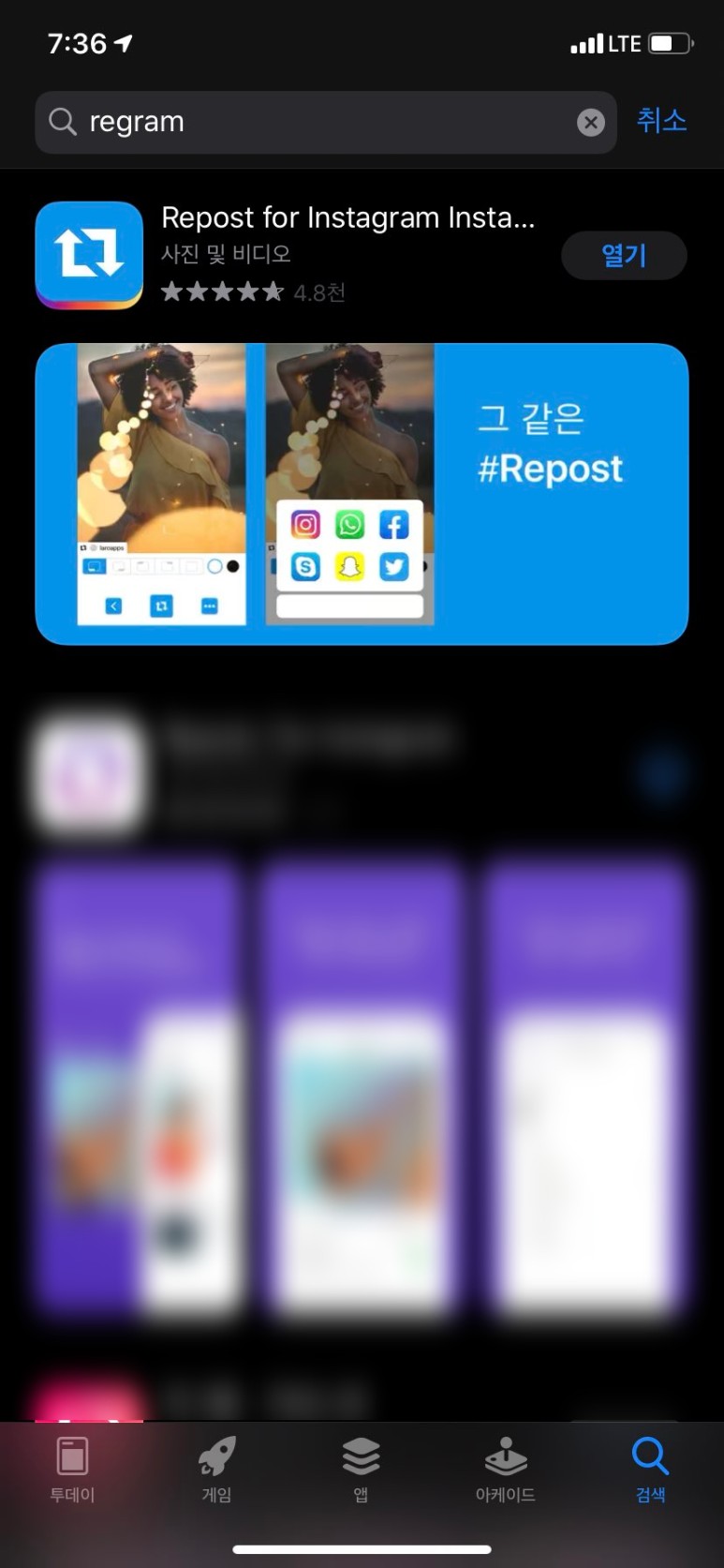 여기서 영어로 'Regram' 이라고 치신 뒤 제가 다운 받은 'Repost For Instagram Instasave' 이라는 어플을 받아줍니다.
