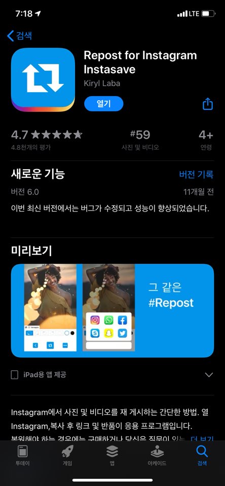 이 행동, 즉 어플을 사용해서 다시 포스팅(공유)하는 행동을 리그램 또는 리포스트 라고 합니다.