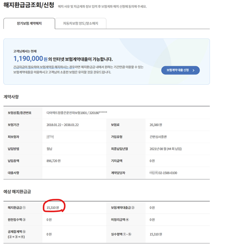 2. 장기계약 해지환급금 조회 버튼을 클릭합니다.