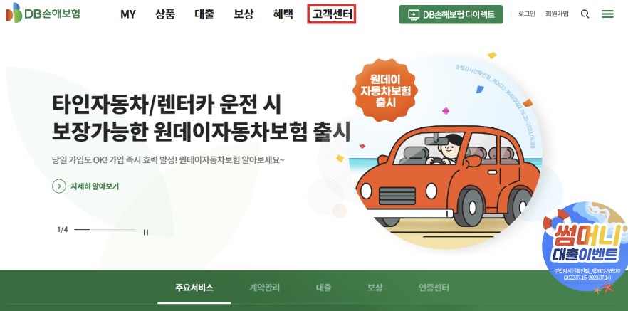 DB손해보험 홈페이지에 접속하면 상단에 주요 메뉴가 있습니다. 상품 / 대출 / 보상 / 혜택 / 고객센터 탭에서 고객센터 탭을 클릭하면 됩니다.