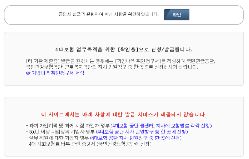 이 안내 메시지는 4대보험 확인서는 4대보험 업무목적에 한해 확인하기 위한 서류이며, 기타 목적(대표적으로 재직증명이나 대출용)의 사용에는 발급기관이 책임지지 않는다는 사실을 통지하고 있습니다.