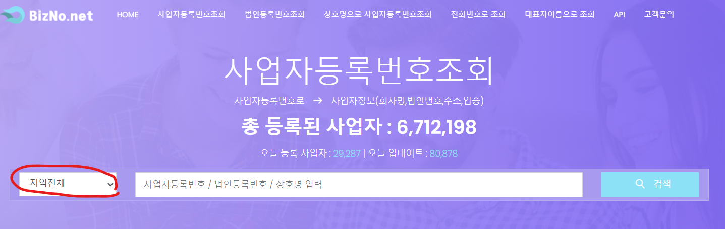 표시된 부분의 [지역전체] 탭을 클릭하시면 서울, 부산 등 원하는 지역으로 한정지어 사업자등록번호를 조회해볼 수 있습니다. 개인적으로는 공정거래위원회보다 훨씬 간편하게 개인사업자등록번호 조회를 할 수 있었던 것 같습니다.
