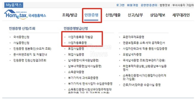 3. 민원증명 탭 클릭, 사업자등록증명 재발급 또는 사업자등록증명을 탭을 클릭해줍니다.