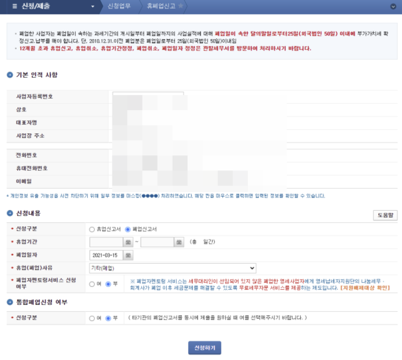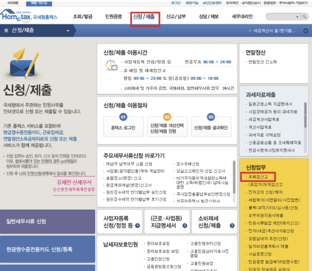 공인인증서를 통해 로그인해주신 후 신청/제출 탭을 클릭해주세요. 그 다음 신청업무 메뉴 란에 있는 [휴폐업신고]탭을 클릭해주시면 됩니다.