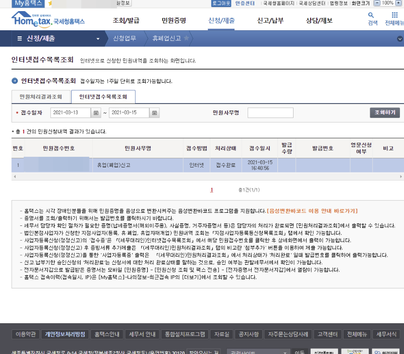 휴폐업 신고 절차가 마무리되면 접수 목록 화면에서 접수 되었는지 여부를 확인해보실 수 있습니다. 또한 홈택스의 [민원증명] 메뉴 탭을 클릭하시면 폐업사실증명서도 발급받을 수 있습니다. 일반적으로 폐업 신청을 한 후 영업일 기준 2~3일 정도 소요되니 참고하시길 바랍니다.