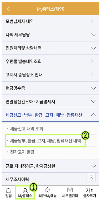 일단 국세청 손택스 어플 로그인을 해주세요. 앱에서 [my홈택스] 탭 클릭, [세금납부,환급,고지,체납,압류재산 내역] 메뉴를 클릭해주세요.