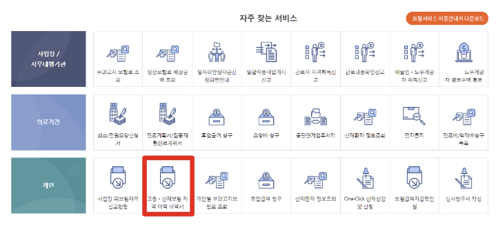 2. 고용산재보험 토탈서비스에 접속하셨다면 로그인 해주세요. 로그인을 하신 후 나타나는 창 아래의 [고용 산재 보험 자격 이력 내역서] 탭을 클릭합니다.