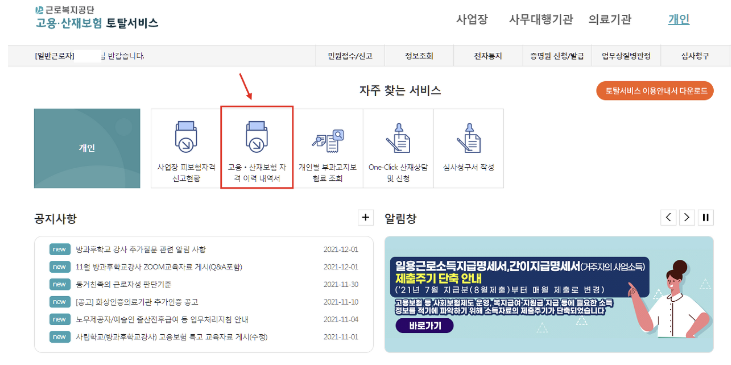가끔가다 [고용보험 가입이력조회]를 누르시는 분이 있는데 이것보다 [고용보험 자격이력내역서]에 접속하시는 것이 더 간편합니다.