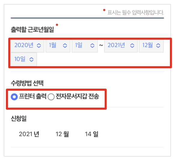 출력 년월일 및 수령방법을 선택하시면 최종적으로 가입이력내역조회를 할 수 있습니다.