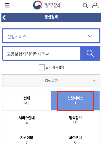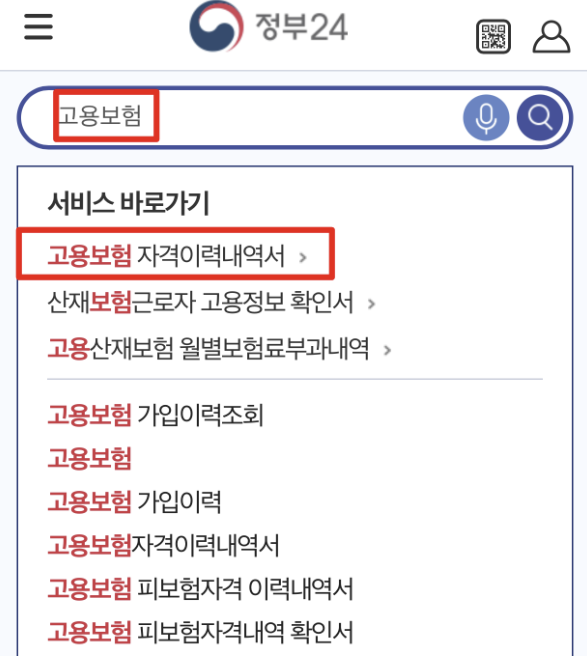 2. 정부 24 앱을 접속하셨으면 검색창에서 고용 보험을 검색, 첫 번째인 [고용보험 자격이력내역서] 탭을 클릭합니다.