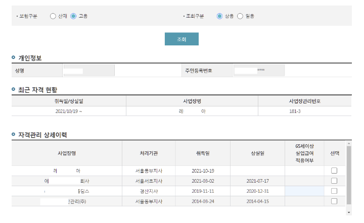 고용보험이 가입된 경우 하단의 화면처럼 자격 관리 상세 이력이 나옵니다. 아무것도 나오지 않는 경우 고용보험이 가입되어 있지 않은 상태입니다.