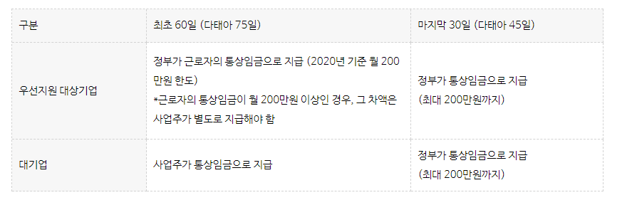 90일의 출산휴가 기간 중 마지막 30일은, 정부에서 지급하는 통상임금이 [출산휴가급여 200만원]으로 제한됩니다. 이는 대기업과 우선지원 대상기업 모두 공통으로 적용됩니다.