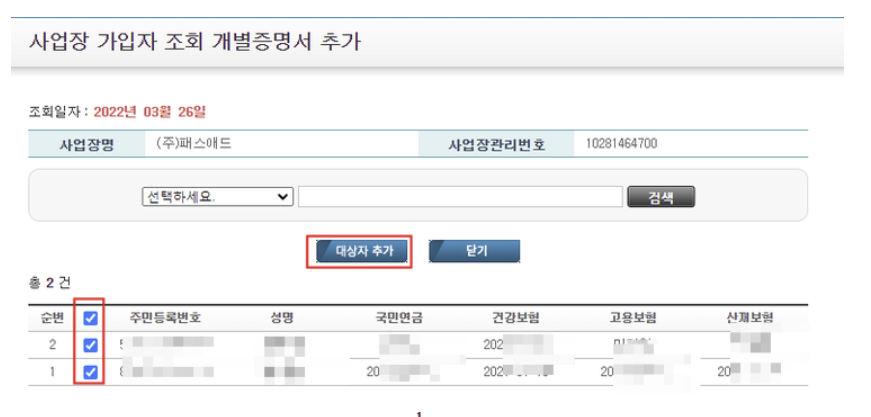 3. 대상자 추가를 하여 가입자 조회 및 개별증명서 추가로서 순번 옆 체크를 하면 모든 4대보험가입자명부 그리고 개별적으로 선택을 하여 개별증명서로 나눠집니다.