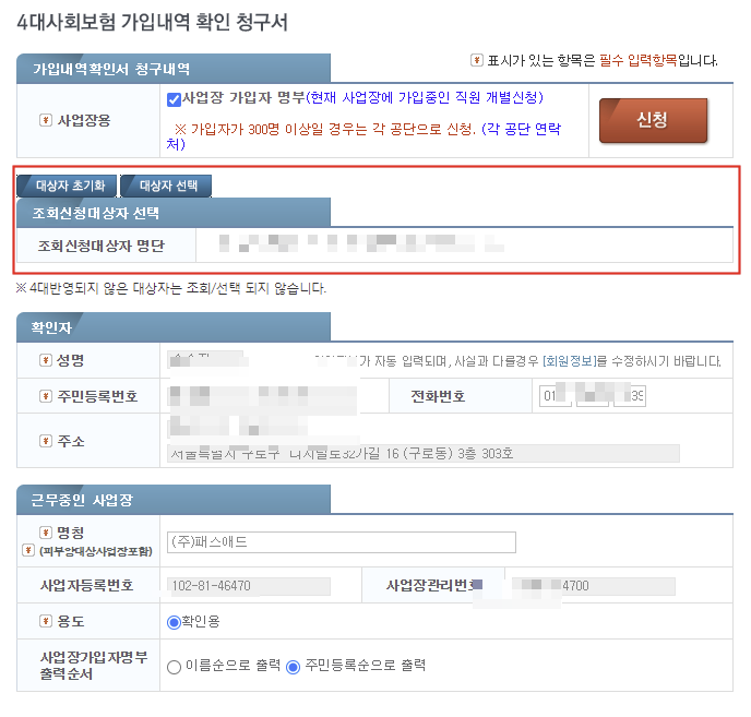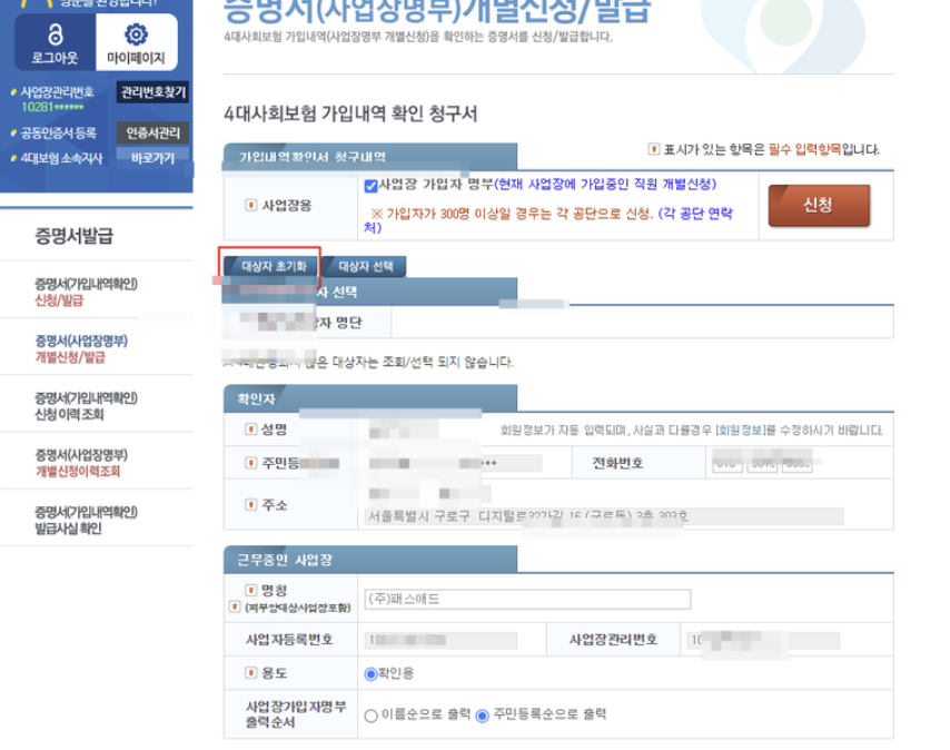 2. 4대보험가입자명부 발급 신청 메뉴를 클릭하시면 대상자 초기화 및 대상자 선택 클릭을 하실 수 있습니다. 여기서 확인하려고 하는 가입자 선택을 하여 내용을 포함하실 수 있습니다.