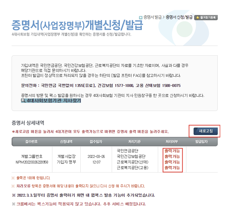 5. 4대보험 가입자명부 발급 신청을 하면 하단 처리여부 상에서 출력가능이라는 표시가 모두 나올 때 까지 상단 새로고침을 계속 클릭하여 줍니다. 모두 빨간글씨가 나오게 되면 하단 출력을 클릭하여 pdf로 다운받을 수 있습니다.