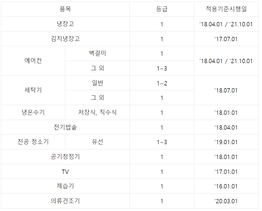 고효율가전 환급의 경우 에너지 효율 등급도 중요하지만, 표 오른쪽에 적용기준시행일도 아주 중요하다는 점 명심하시길 바랍니다.