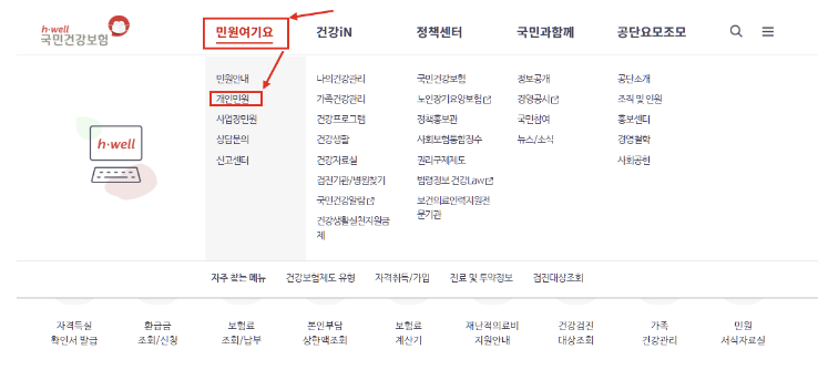 - 국민건강보험 상단 메뉴의 [민원여기요] 탭을 클릭한 후 [개인민원] 메뉴를 클릭합니다.