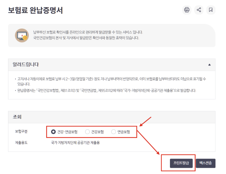건강보험 완납증명서 발급을 원하실 경우 건강보험만 클릭을, 연금보험만 필요한 경우 연금보험만 클릭, 건강보험및 연금보험 둘다 클릭후 프린트 발급하면 건강보험완납증명서 발급하기를 하실 수 있습니다.