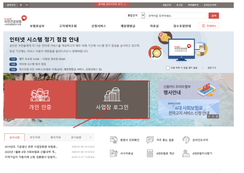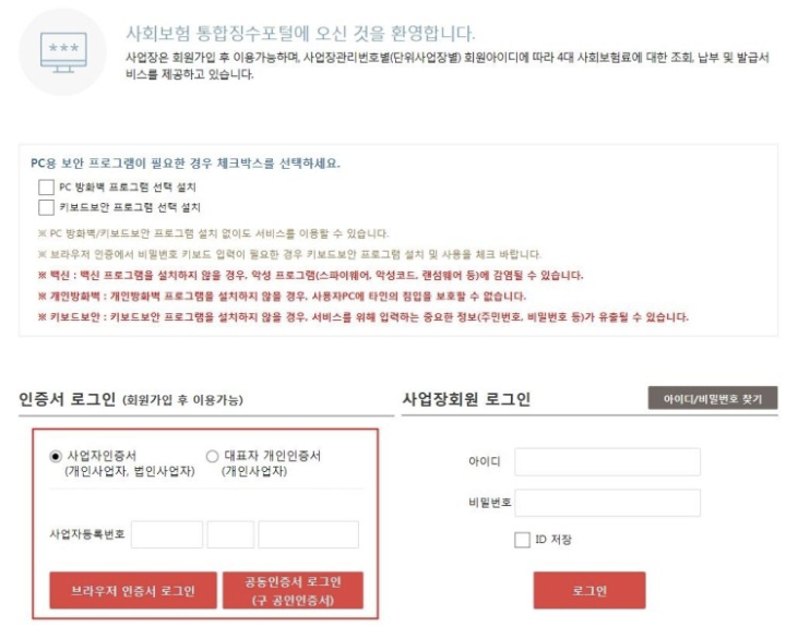 - 사업장으로 로그인을 선택하시고 반드시 공인인증서로 로그인해야 합니다.