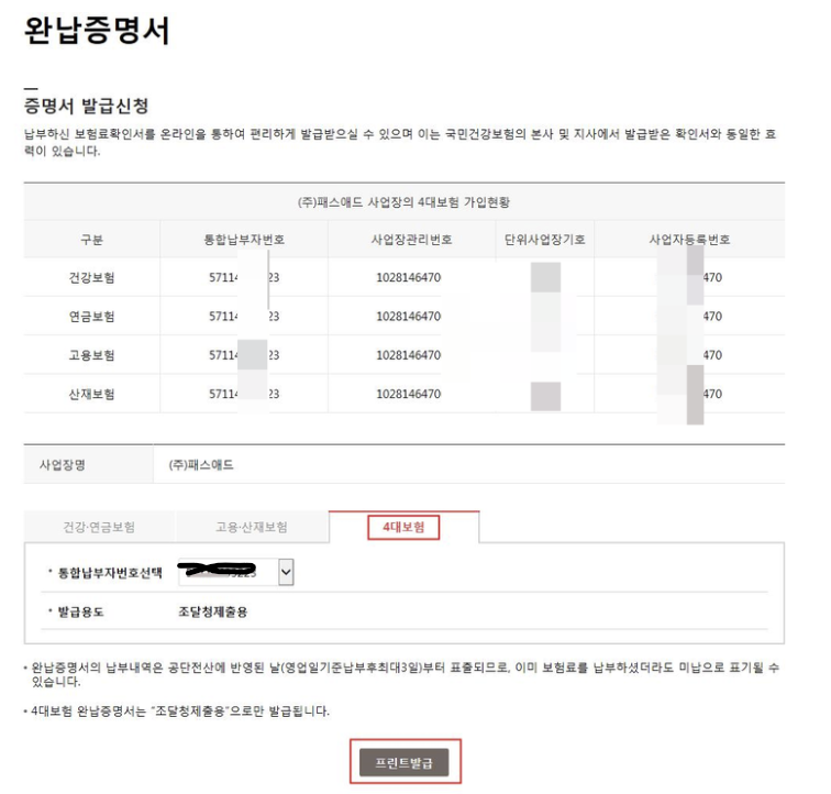 사업자 4대보험 완납증명서 발급