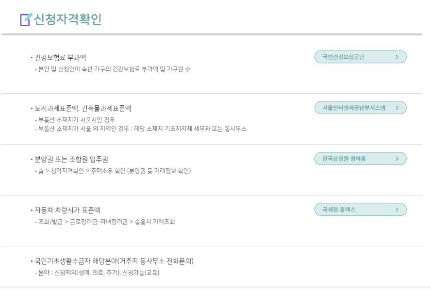 서울시 홈페이지에서는 신청자격 자가진단 서비스를 제공하고 있습니다. '서울시 홈페이지'에 기 가입된 상태라면 바로 자가진단을 진행하시면 되고, 아닌 경우는 아래 링크에 접속해서 회원가입 후 신청자격을 확인하시는 것을 추천드립니다.