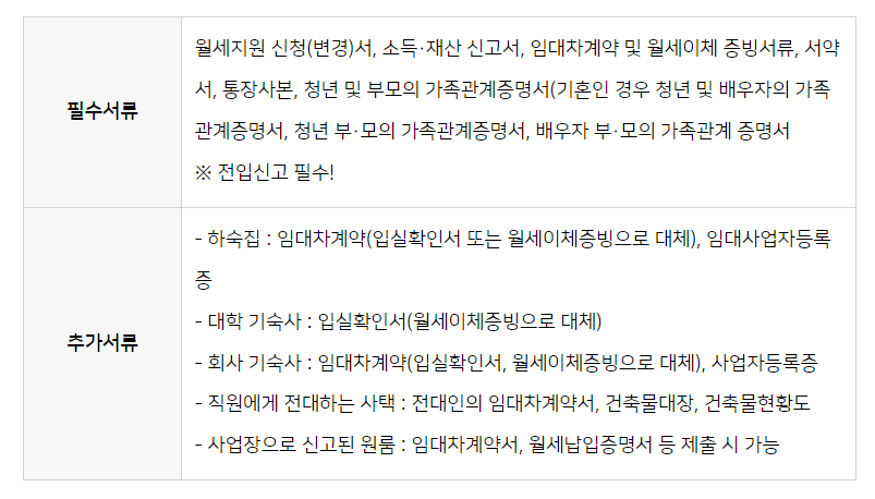 청년월세지원 신청 시 필요한 서류는 다음 표를 참고하세요.