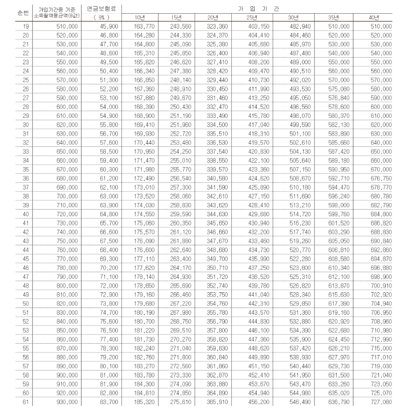 - 국민연금 예상수령액표 월소득을 기준으로 찾을경우 좌측에서 2번째 기준소득월액 평균액(35만원,36만원,37만원...553만원)에서 대략적인 금액을 찾습니다. (월 납부하는 보험료를 기준으로 찾고 싶은경우 3번째 "연금보험료"에서 찾습니다.)
