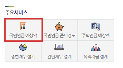 우측 중간에 있는 [주요서비스] 메뉴 중 [국민연금 예상액] 메뉴를 클릭합니다.