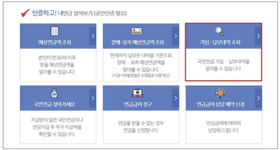 - [가입, 납부내역 조회]에서 국민연금 가입, 납부내역을 알아볼 수 있습니다.