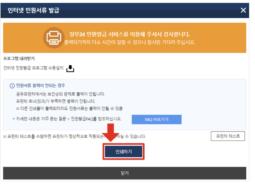 8. [인쇄하기]를 클릭하면 서류가 발급됩니다.