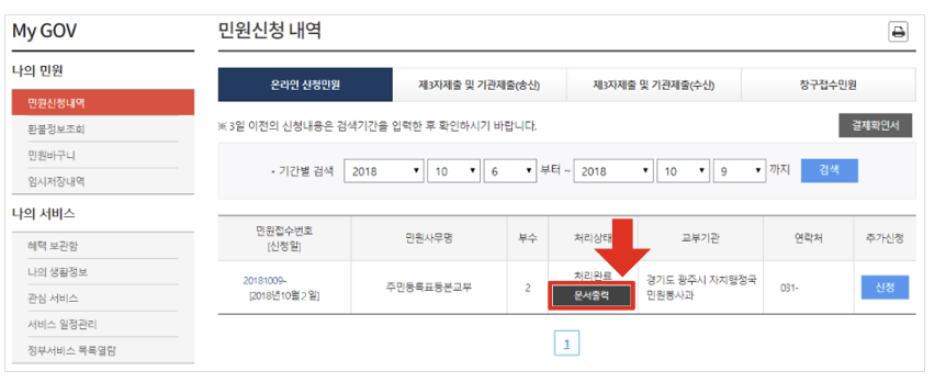 신청을 클릭하면 민원신청 내역 화면으로 전환됩니다. 신청 내역을 확인하고 문서출력 버튼을 클릭해주세요.