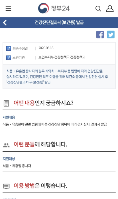 인터넷 발급인 경우에는 보건소 홈페이지나 공공보건포털, 정부 24를 이용하여 보건증을 발급받으면 됩니다.