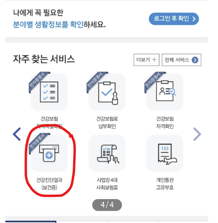 정부24에 들어가서 네 번째까지 창으로 이동하시면 건강진단결과(보건증)이 보입니다.