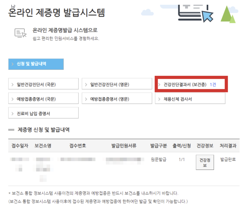 4. 공인인증서를 통한 로그인이 완료되면 신청 및 발급내역에서 건강진단결과서(보건증)을 확인할 수 있습니다.