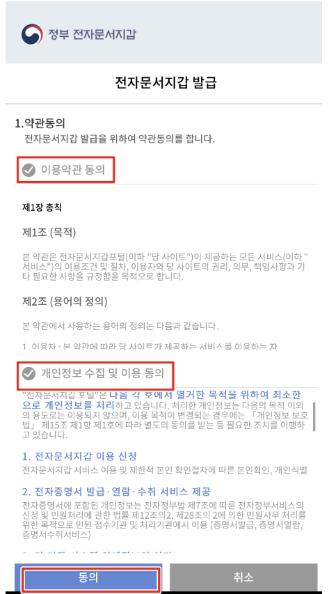 5. 전자문서지갑 발급의 개인정보 수집 및 이용 동의 에 체크 후 하단의 동의 를 클릭합니다.