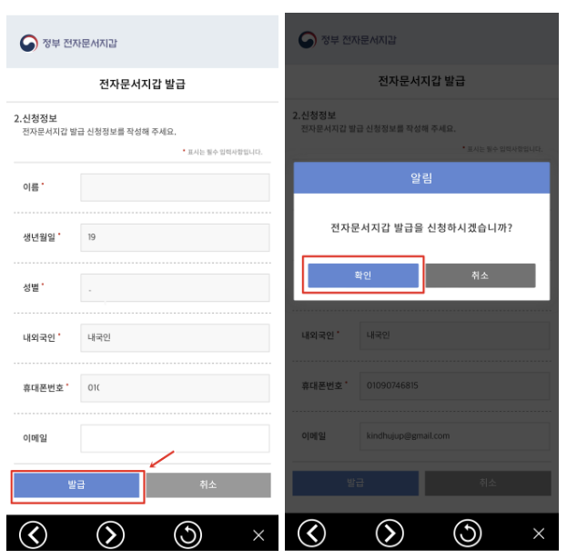 6. 전자문서지갑을 발급하는 본인의 신청 정보가 맞는지 확인후 발급을 클릭합니다.