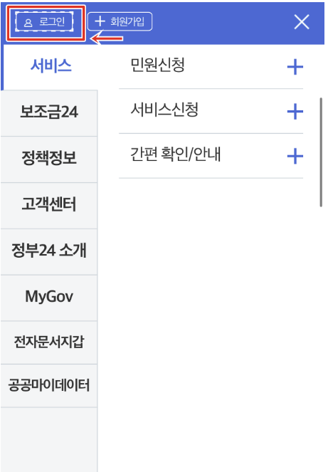 1. 정부 24 앱 왼쪽 상단의 로그인을 클릭합니다.