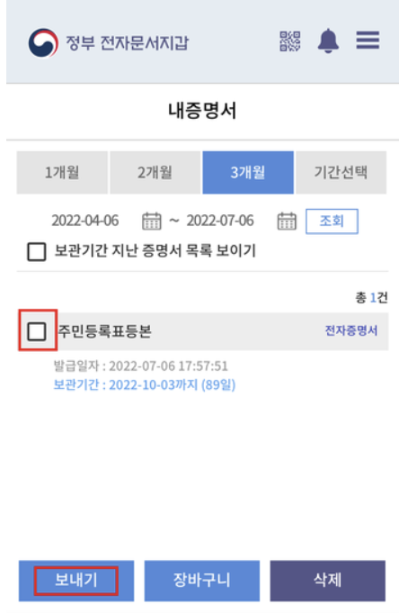 지갑 안에 들어가면 증명서 발급되어 있는 것을 확인할 수 있습니다. 여기서 전자문서지갑 열람도 가능하고 기관으로 전송도 가능하다는 점 참고하시길 바랍니다. 정부24 전자문서지갑 pdf 파일 형식 열람은 지원하고 있지 않습니다.