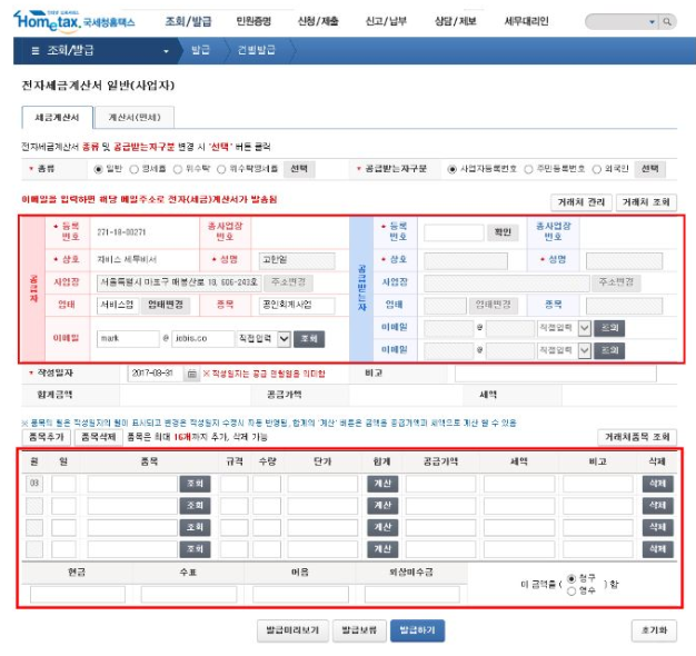 위의 빨간색 칸의 공급자/ 공급받는자의 정보, 거래 금액을 입력하면 됩니다. 만약 영세율 등의 세금계산서 발급을 원하시는 경우, 왼쪽상단, [종류]에서 영세율에 표시해주세요.