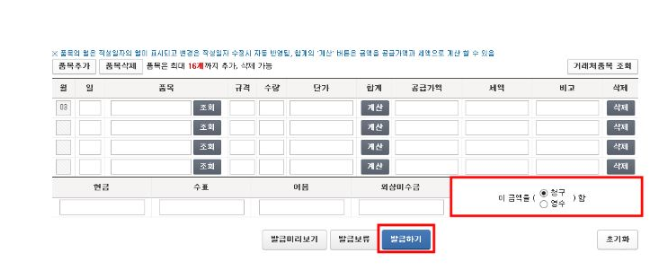 해당금액을 이미 받으신 경우 영수 / 아직 받기 전인 경우 청구로 선택 후, [발급하기] 메뉴를 클릭하면 됩니다.