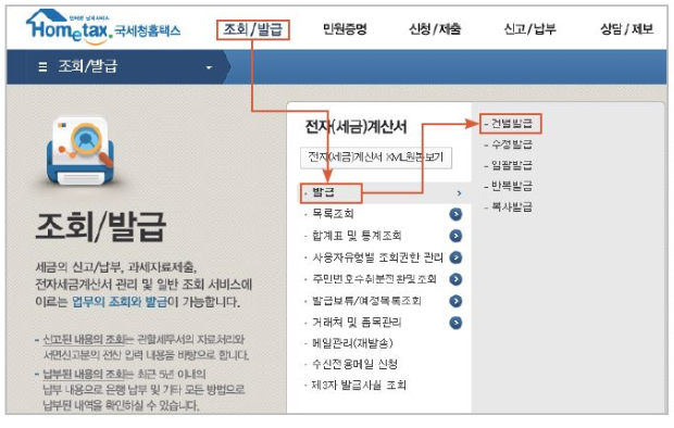 2. 조회/발급 메뉴> 발급> 건별발급 메뉴를 클릭합니다.