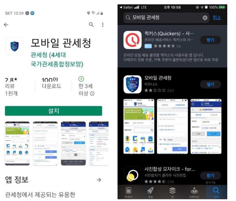 안드로이드, IOS 각자의 [모바일 관세청] 어플 다운로드 하세요