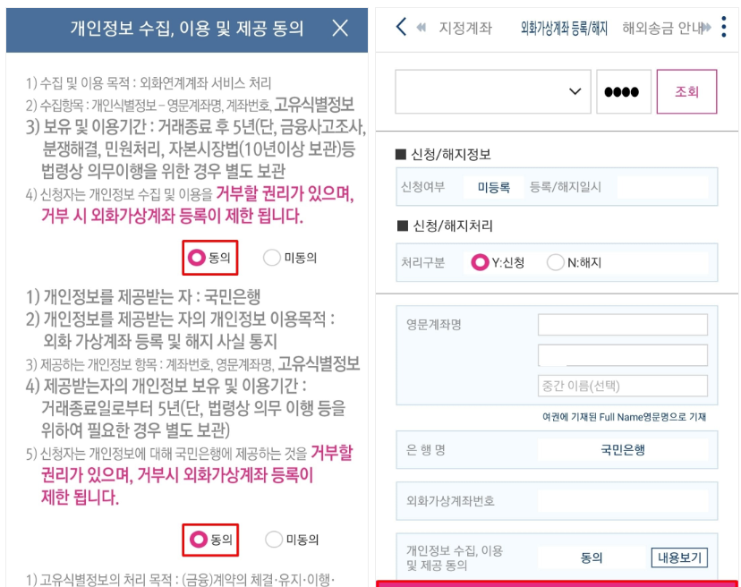 5. 모두 동의한 후 확인을 클릭합니다. 그리고 외화가상계좌 등록/해지 페이지에서 확인을 누릅니다.