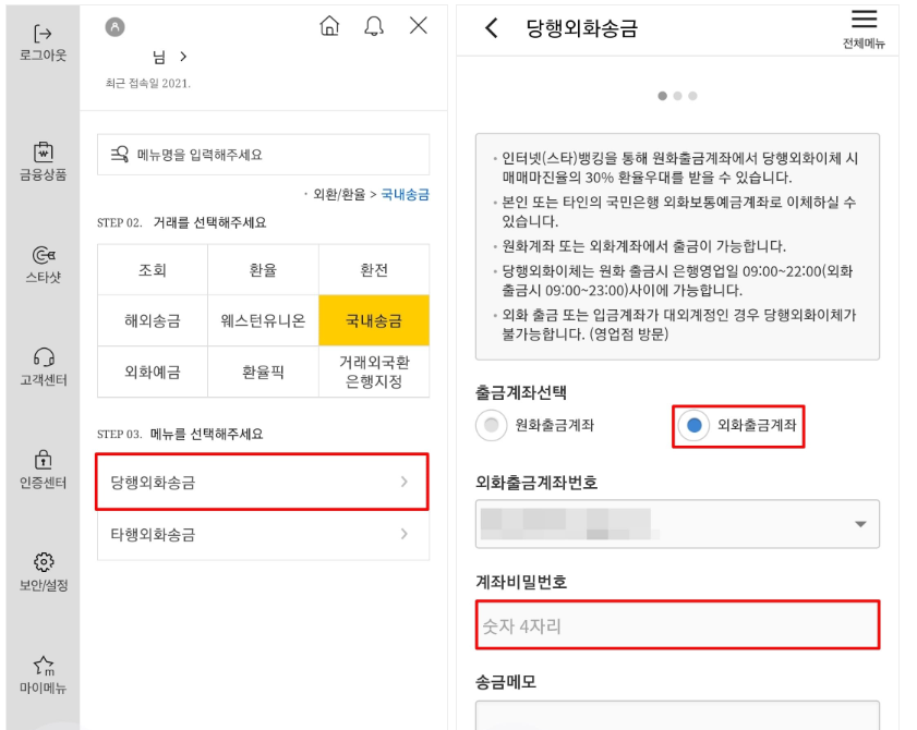 8. 당행외화송금을 클릭 후 출금계좌선택에서 외화출금계좌를 선택합니다. 나의 국민 외화통장의 숫자 4자리 계좌비밀번호를 입력합니다.