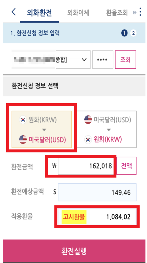 2. 외화 환전 창에서 화면을 아래로 조금 내려보면 환전 정보 선택란이 나오는데 여기서 원화를 달러로 선택해주시고, 환전할 금액을 입력 후, 현재 고시 환율을 보고 환전 실행을 눌러 줍니다.