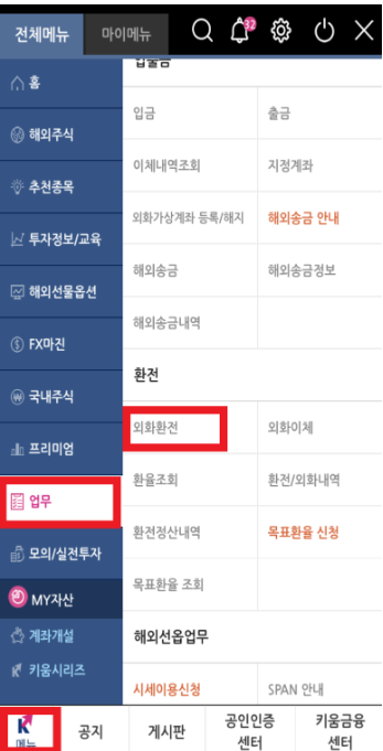 1. 키움증권 어플을 접속한 후 메뉴 선택 -> 업무 -> 외화 환전을 선택해 줍시다.